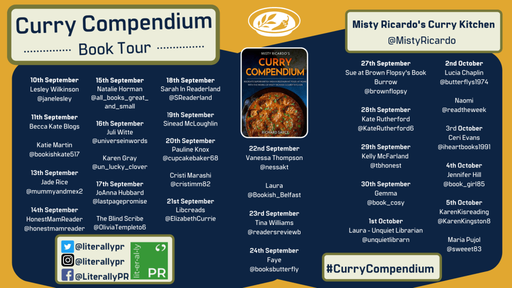 Firstly, thank you to everyone at @literallypr for inviting me to take part in this tour, everyone I have spoken to there has been fantastic. Not only did I get a copy of a PDF version of Curry Compendium, they treated me to a hardback copy also which is absolutely beautiful. Curry Compendium was published on 10th September 2021 and you can get a copy here.